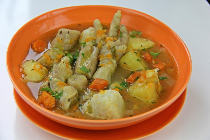 What is it: Gungo Peas Soup is a Jamaican favorite. It is a rich Jamaican soup that features beef, pigtails, gungo peas, yellow yam, carrots, pumpkin, and dumplings. Often served as “Saturday soup”. What to eat with: By itself.